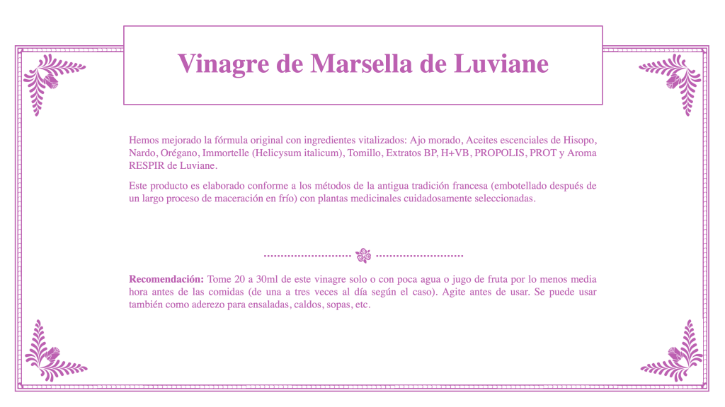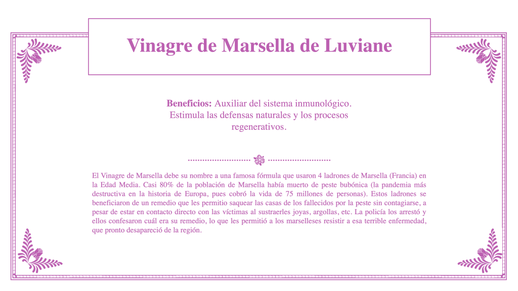 Nota: el Vinagre de Marsella debe su nombre a una famosa fórmula que usaron 4 ladrones de Marsella (ciudad en el sur de Francia) en la Edad Media. Casi 80% de la población de Marsella había muerto de peste bubónica (la pandemia más destructiva en la historia de Europa, pues cobró la vida de 75 millones de personas). Estos ladrones se beneficiaron de un remedio que les permitió saquear las casas de los fallecidos por la peste sin contagiarse, a pesar de estar en contacto directo con las víctimas al sustraerles joyas, argollas, etc. La policía los arrestó y ellos confesaron cuál era su remedio, lo que les permitió a los marselleses resistir a esa terrible enfermedad, que pronto desapareció de la región.